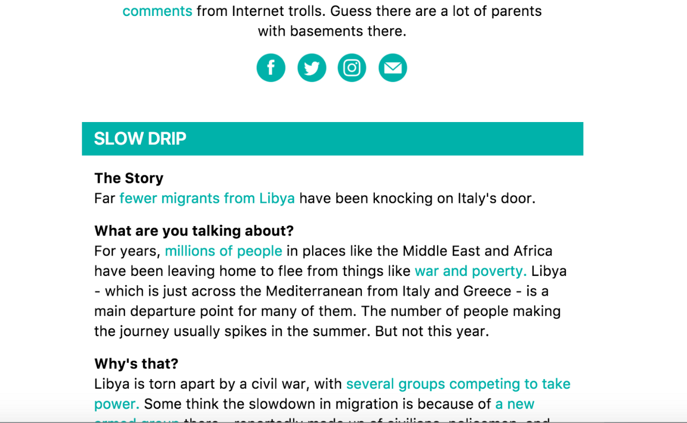 This newsletter adds value by explicating, in long-form, a complex idea that the subscribers of something like TheSkimm will find value in. In this case, that’s the complex idea of migrants going to Europe from Libya.