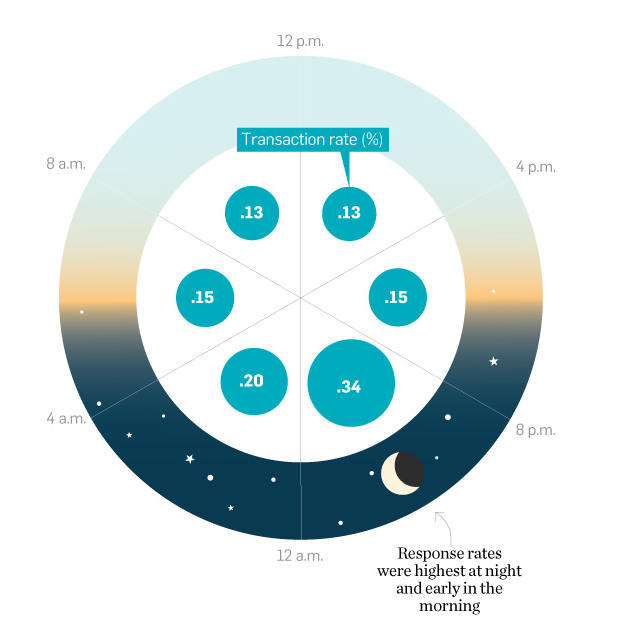 People like to check their email before they go to bed. Take advantage of this and send them something when they have more time to poke around their inbox than during the rushed commute to and from work.